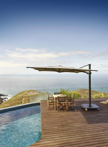 Модель JCP.4 Сaractere сочетает в себе технический интеллект и высококачественные материалы с аккуратным дизайном и элегантностью. Зонт имеет наклон по высоте, также дополнительным преимуществом модели является возможность вращения зонта на 360° - Вы можете создавать тень там, где это нужно в данный момент. Положение купола можно легко заблокировать на любой высоте. Все элементы имеют восьмиугольную форму: опора, спицы, бегунок, база. Переход от опоры к утяжелительной базе практически незаметен, создаётся ощущение, что это цельное изделие. Утяжелительная база из нержавеющей стали оснащена колесами с повышенной проходимостью, которые вращаются на 360°.