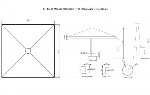Mega Telescopic Manuel - профессиональный телескопический зонт с центральной опорой из алюминия Ø100 мм, которая обеспечивает высокую устойчивость. Модель Mega Telescopic Manuel открывается вручную, чем отличается от Mega Telescopic. Зонт, который открывается и закрывается одной рукой может без проблем служить долгие годы. Зонт обеспечивает большую площадь затенения благодаря своим размерам, а благодаря телескопической системе при открывании и закрывании купола, не нужно беспокоить посетителей. Телескопическая система открытия-закрытия зонта позволяет использовать модель в уличных кафе и ресторанах и при этом нет необходимости передвигать мебель под зонтом. При закрытии зонт приподнимается и закрывается.