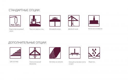 Купол зонта возможен двух вариантов: стандартный и с системой Split. Split-система - это инновационная технология, разработанная для повышения устойчивости зонта к ветру и дождю. Эта функция "анти-ветер" основана на специальной конструкции тента, в которой предусмотрены прорези. Такие прорези позволяют ветру проходить сквозь тент, предотвращая создание парусного эффекта и обеспечивая стабильность зонта во время сильного ветра. Дождевые капли также легко стекают по полосам тента благодаря этой конструкции, минимизируя вероятность попадания воды внутрь зонта.