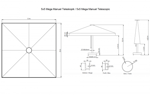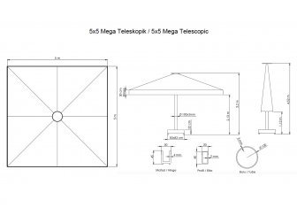Mega Telescopic Manuel - профессиональный телескопический зонт с центральной опорой из алюминия Ø100 мм, которая обеспечивает высокую устойчивость. Модель Mega Telescopic Manuel открывается вручную, чем отличается от Mega Telescopic. Зонт, который открывается и закрывается одной рукой может без проблем служить долгие годы. Зонт обеспечивает большую площадь затенения благодаря своим размерам, а благодаря телескопической системе при открывании и закрывании купола, не нужно беспокоить посетителей. Телескопическая система открытия-закрытия зонта позволяет использовать модель в уличных кафе и ресторанах и при этом нет необходимости передвигать мебель под зонтом. При закрытии зонт приподнимается и закрывается.