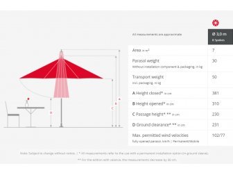 Специальная запатентованная система гибких спиц помогает зонту не бояться сильного ветра с моря, а ткань акрил Solution dyed-Dolan гарантирует яркость тента в течение 5 лет.
