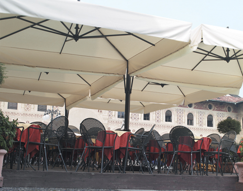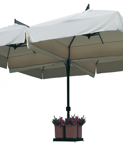Максимальная четкость форм и размеров благодаря центральной опоре, на которой установлены четыре купола зонта Quadruplo. Специальный усиленный каркас делает модель идеальным изделием для затенения больших пространств. Каждый зонт имеет независимый механизм открытия, и все зонты можно закрыть даже при наличии мебели под ними. Спицы заменяются по отдельности без необходимости разборки всей конструкции, а ткань навеса легко снимается для обслуживания или замены. Фурнитура из нержавеющей стали. Алюминиевый каркас, детали из нержавеющей стали. Стабилизатор обеспечивает более высокую стабильность зонта в очень ветреных условиях.