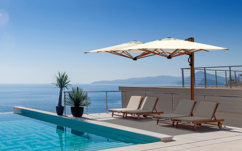 Серия Galaxia Dual Timber - это эволюция зонта Astro. Возможны два варианты Dual T и Dual V, отличающиеся креплением куполов к опоре. Алюминиевый каркас выполнен с эпоксидным покрытием антрацитового или белого цвета. Эта модель - отличное решение для больших открытых пространств. Выдвижной механизм обеспечивает возможность открывать и закрывать куполы над столами и стульями без перемещения мебели.