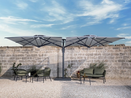 Серия Galaxia Dual Carbon/StarWhite - это эволюция зонта Astro. Возможны два варианты Dual T и Dual V, отличающиеся креплением куполов к опоре. Алюминиевый каркас выполнен с эпоксидным покрытием антрацитового или белого цвета. Эта модель - отличное решение для больших открытых пространств. Выдвижной механизм обеспечивает возможность открывать и закрывать куполы над столами и стульями без перемещения мебели.