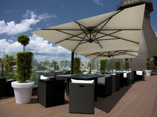 Alu Double Dark состоит из двух отдельных зонтов, закрепленных на одной центральной опоре. Модель - элегантный образец дизайна с особым вниманием к деталям и отделке. Двухкупольный зонт подходит для затенения больших пространств, при этом занимает минимум площади.