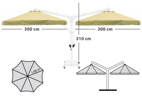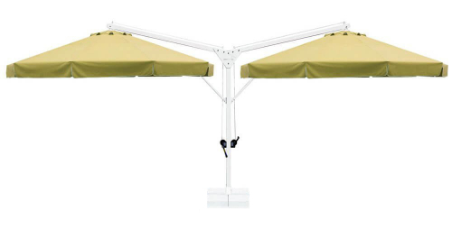 Double Banana - единая база, но больше затенения. Одна опора и два зонта, открывающиеся по бокам, обеспечивают затененную уютную атмосферу на любых открытых площадках. Алюминиевая конструкция, европейская ткань и утяжелительная база гарантируют простое использование.