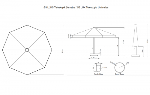 Телескопическая система открытия-закрытия зонта позволяет использовать модель в уличных кафе и ресторанах и при этом нет необходимости передвигать мебель под зонтом. При закрытии зонт приподнимается и закрывается. Зонт Lux Telescopic подходит для ресторанов и кафе, а также для садов и террас.