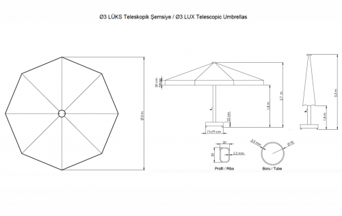 Телескопическая система открытия-закрытия зонта позволяет использовать модель в уличных кафе и ресторанах и при этом нет необходимости передвигать мебель под зонтом. При закрытии зонт приподнимается и закрывается. Зонт Lux Telescopic подходит для ресторанов и кафе, а также для садов и террас.