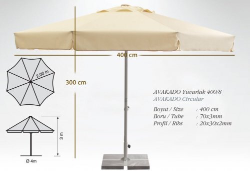 Avocado - профессиональный зонт с центральной опорой из алюминия, что обеспечивает высокую устойчивость модели. Он защитит от ярких солнечных лучей и создаст приятную затененную атмосферу в частных садах, открытых летних площадках кафе, баров и ресторанов, зоны возле бассейна.