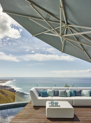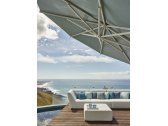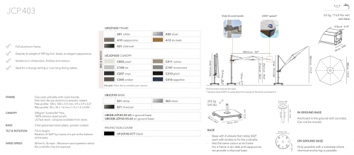 Модель JCP.4 Сaractere сочетает в себе технический интеллект и высококачественные материалы с аккуратным дизайном и элегантностью. Зонт имеет наклон по высоте, также дополнительным преимуществом модели является возможность вращения зонта на 360° - Вы можете создавать тень там, где это нужно в данный момент. Положение купола можно легко заблокировать на любой высоте. Все элементы имеют восьмиугольную форму: опора, спицы, бегунок, база. Переход от опоры к утяжелительной базе практически незаметен, создаётся ощущение, что это цельное изделие. Утяжелительная база из нержавеющей стали оснащена колесами с повышенной проходимостью, которые вращаются на 360°.
