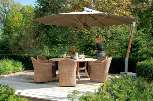 Элегантный и функциональный зонт Capri станет украшением частного сада или террасы кафе и ресторана. Он вращается вокруг основания на 360° и легко открывается с помощью ручной лебедки. Имеется система быстрой замены спиц, ткань купола легко снимается для обслуживания или замены.