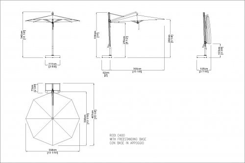 Инновационный дизайн позволяет поворачивать открытый и зонт Rodi на 360° вокруг основания и легко открывать при помощи ручной лебедки. Одно движение закрывает зонт без необходимости перемещать мебель под ним. Идеально подходит как для бытового использования (загородные дома), так и для коммерческого использования (кафе, бары, рестораны). Каждая спица может быть заменена индивидуально, без необходимости разбирать всю конструкцию, а ткань навеса легко снимается для обслуживания или замены. Все продукты FIM разработаны и изготовлены в Италии с использованием лучших материалов для наружного применения, чтобы гарантировать исключительную долговечность даже в самых жестких условиях окружающей среды.