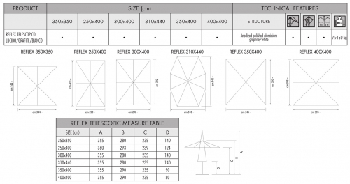 Оригинальная система открывания и закрывания, которая не требует перемещения столов и стульев под зонтом, делает Reflex Telescopico идеальным продуктом для затенения больших пространств. Данная модель подходит для частного и коммерческого использования. Алюминиевый каркас, легкая система открытия и крепеж из нержавеющей стали. Каждая спица может быть заменена индивидуально, без необходимости разбирать всю конструкцию, а ткань навеса легко снимается для обслуживания или замены. Все продукты FIM разработаны и изготовлены в Италии с использованием лучших материалов для наружного применения, чтобы гарантировать исключительную долговечность даже в самых жестких условиях окружающей среды.