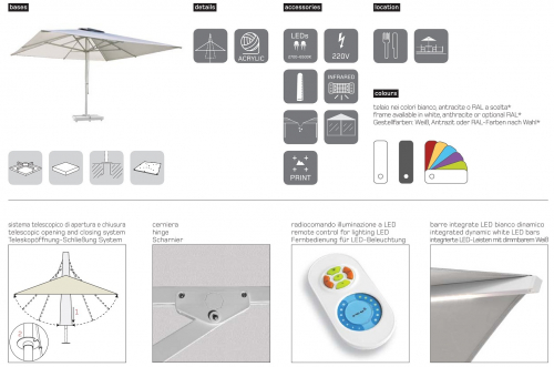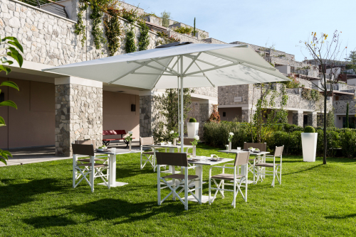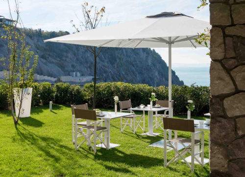 Minosse – изысканный телескопический зонт с прочной, но с легко перемещаемой конструкцией. Красота и чистота в дизайне в сочетании с высокой практичностью делают модель превосходным зонтом, идеально подходящим для использования на многих типах террас, в кафе, клубах, ресторанах и курортах. Также он подходит для разнообразных частных проектов.