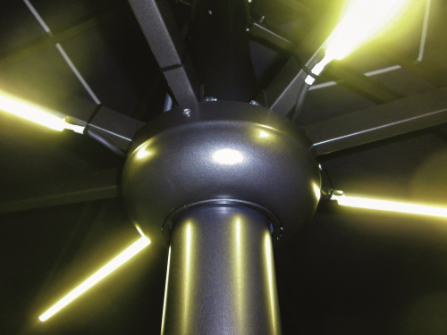 LED Lighting KIT - cистема светодиодного освещения с кабелями, проходящими внутри рамы зонта. Может состоять из 4, 8, 10 либо 12 светодиодных панелей из анодированного алюминия. По умолчанию - теплый свет 2700K, по запросу - холодный свет либо комплект RGB-ламп. Степень защиты IP65 - полная защита от проникновения пыли, защита от струй воды со всех направлений.