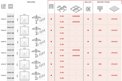 Таблица выбора утяжелительных баз для стабилизации зонта.