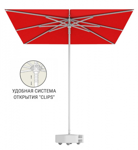 Kiwi Clips - профессиональный зонт с центральной опорой из алюминия, что обеспечивает высокую устойчивость модели. Он защитит от ярких солнечных лучей и создаст приятную затененную атмосферу в частных садах, открытых летних площадках кафе, баров и ресторанов, зоны возле бассейна.