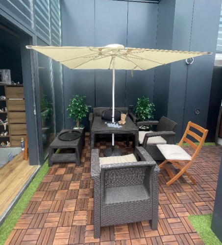 Это больше, чем зонт, с его эстетичным и стильным внешним видом, простотой открытия и закрытия, долговечностью и дополнительными функциями, такими как журнальный столик и пепельница.
