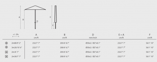 Зонт Nata выпускается в двух моделях: круглой и квадратной, каждая в двух размерах. Круглая диаметром 2800 мм или 3200 мм, квадратная 2000x2000 мм и 2300x2300 мм.