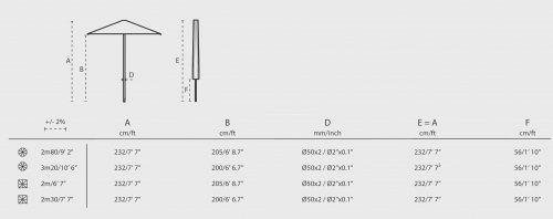 Зонт Nata выпускается в двух моделях: круглой и квадратной, каждая в двух размерах. Круглая диаметром 2800 мм или 3200 мм, квадратная 2000x2000 мм и 2300x2300 мм.