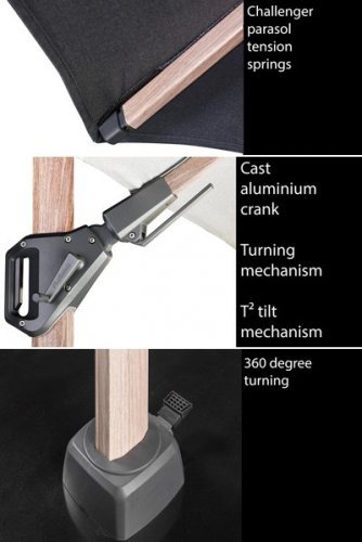 Challenger T2 - это наиболее современное оборудование, изготовленное на основе самых высоких стандартов. Каркас зонта выполнен из устойчивого к коррозии и погодным условиям алюминиевого сплава, гарантирующего прочность и стабильность. Купол создан из полиэстера, устойчивого к пыли и воде. В конструкции купола в каждой из спиц установлены натяжные пружины, чтобы лучше компенсировать порывы ветра, а ткань всегда была натянута. Выбирая садовый зонт Challenger T2, Вы выбираете роскошный продукт высокого качества, который прослужит Вам в неизменном состоянии долгие годы.