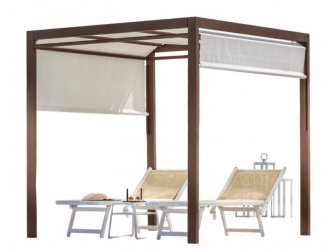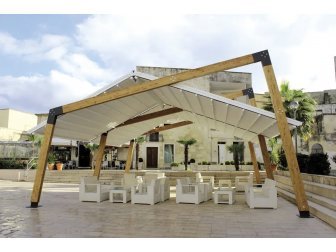 Обычно тент представляет собой конструкцию из нескольких стоек, на которые при помощи растяжек закрепляется ткань. Но могут быть и различные дизайнерские решения, не только создающие тень, но и украшающие открытую площадку.
