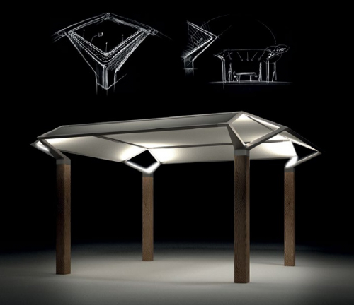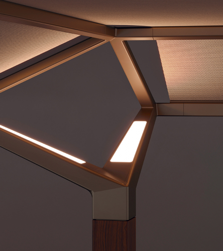 Прочные колонны, составляющие конструкцию, выполнены из матового тика, идеального материала для использования на открытом воздухе и придающего всему проекту органический и экологически чистый вид. Крыша состоит из литых алюминиевых «ветвей», которые тянутся наружу, поддерживая тент. Cosmo оснащен встроенными светодиодами, которые не только обеспечивают правильное освещение в вечернее время, но и подсвечивают навес для создания сказочной расслабляющей атмосферы, делающей всю конструкцию более уютной.