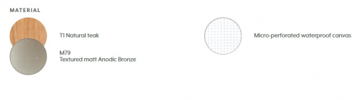 Цена на сайте указана за модель, выполненную из матового тика (Brushed Teak), с конструкцией из алюминия (Aluminium Anodic Bronze) и крышей из полиэстера белого цвета (Polyester Bianco).