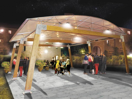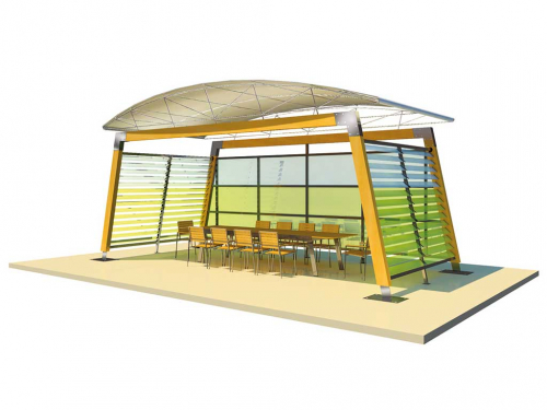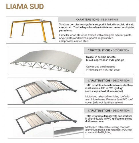 Шатер Liama Sud характерен своей конструкцией из древесины с покрытием тента из ПВХ, которое может быть фиксированным или раздвижным. Особый наклон крыши из ПВХ был спроектирован, чтобы обеспечить широкое и удобное затененное пространство.