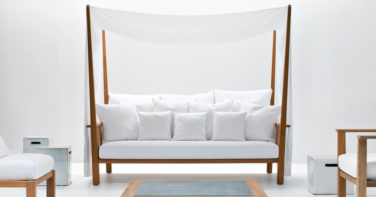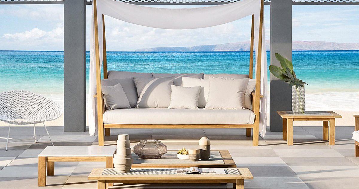 Диван, каркас которого выполнен из тикового дерева, привнесет атмосферу релакса, а навес укроет от палящих солнечных лучей.