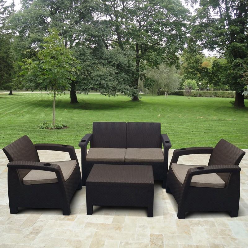 Комплекты с имитацией плетения изготовлены из штампованного пластика, на 100% имитирует искусственный ротанг. Такая мебель не нуждается в особом уходе, не деформируется и не расплетается. Её можно не убирать с улицы круглый год, а чехлы на подушках легко снимаются и стираются.