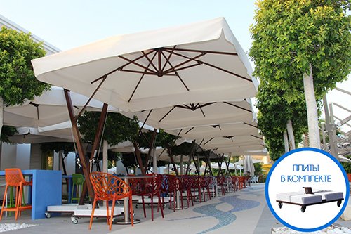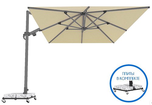 Banana – одна из самых продаваемых моделей, благодаря своему стильному дизайну и высокой устойчивости. Боковая опора выполнена из алюминиевого сплава с обработкой против коррозии. Канат, используемый в системе открытия, используется также на яхтах и судах, что обеспечивает его прочность. Благодаря квадратной или прямоугольной форме купола нет потерь в затеняемой площади в том числе и при составлении нескольких зонтов вместе.