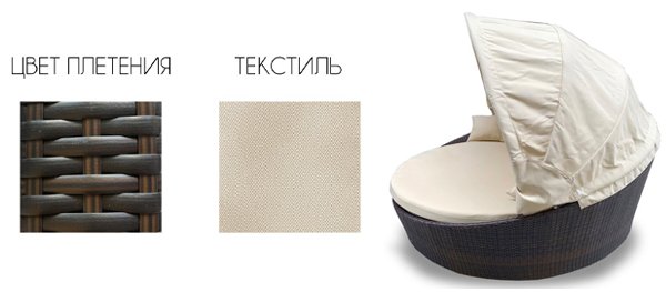 Модель сплетена вручную из искусственного ротанга на алюминиевом каркасе. Подушка для сиденья и 6 мягких подушек для спинки выполнены из водоотталкивающей акриловой ткани на молнии.
