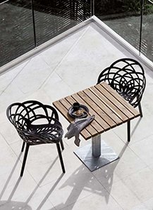 Уникальные формы и дизайн стола будут по душе настоящим ценителям искусства. Для интерьера предлагается хромированное покрытие, для экстерьера порошковая покраска.