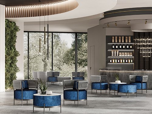В серию входят кресла, пуфы и кофейные столики в двух расцветках - синий и зеленый, а так же кофейный столик белого цвета с плетением из полиэфирного рукава с латексным сердечником. Для окрашивания каркаса и обивочной ткани используются составы красок европейских производителей с самыми высокими показателями устойчивости к воздействию ультрафиолета, влаги, морской воды и механическим повреждениям.