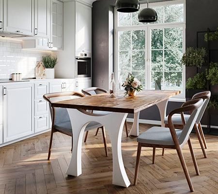 За счет жесткости и прочности конструкции каждое такое подстолье выдерживает тяжелые столешницы, отлично смотрится с массивными столешницами из наборных досок или слэба, а также из натурального или искусственного камня.