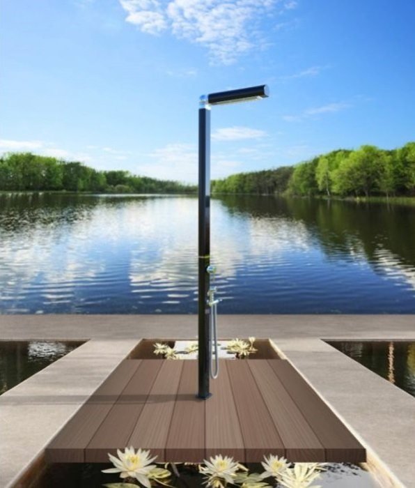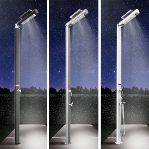 Уличные души Q805, Q825, Q845 особенно подходят для использования на открытом воздухе в темное время суток, ведь они оснащены фотогальванической светодиодной подсветкой, которая крепится к регулируемой душевой насадке.