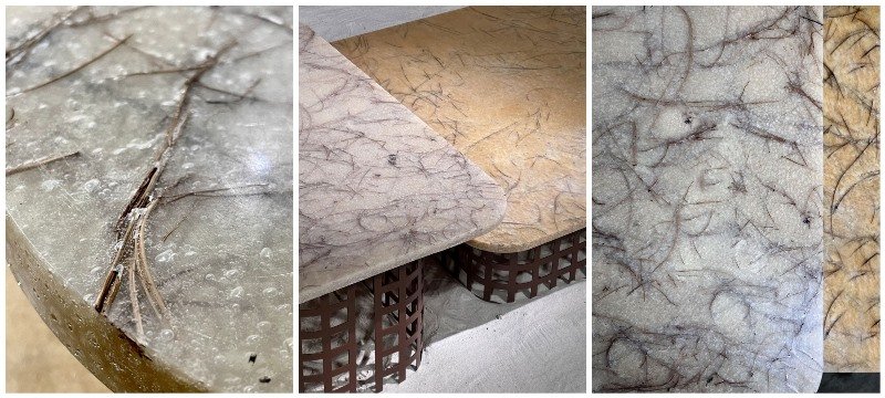 Еще одна новинка - оригинальные столешницы Mara Masai, изготовленные из переработанного полистирола и сосновых иголок, которые придали стенду SLIDE на выставке еще более теплый и экологичный вид.