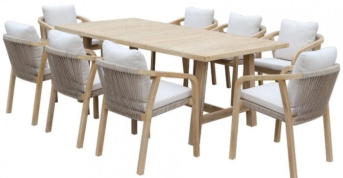 Мебельные комплекты коллекции Rimini будут удачно смотреться как в гостиной квартиры, так и на террасе загородного дома. Высокая спинка и наклонный подлокотник обеспечивают оптимальную поддержку. Веревочное плетение роуп толщиной 6 мм на спинке и подлокотниках кресел излучает стиль в сочетании с деревянными поверхностями. А цвет твердой древесины акации представляет собой натуральный цвет с мелкой текстурой, придающий дереву приятный теплый вид.