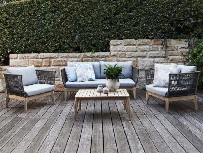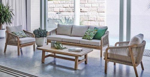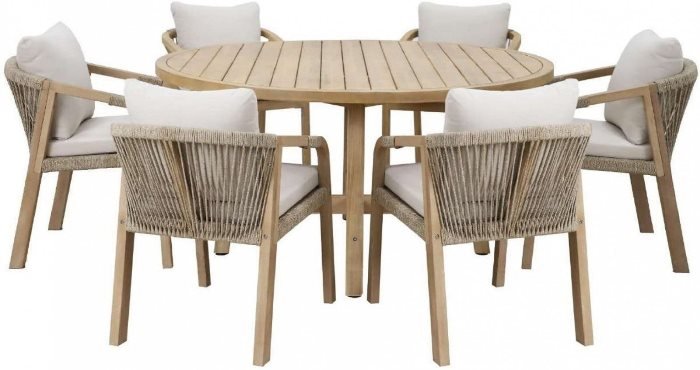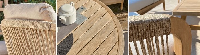 Иногда мелкие детали могут решить все! Сочетая в себе прочную выбеленную древесину твердых пород акации, холодно-серую двойную оплетку морского каната и водостойкие, легко чистящиеся мягкие подушки светло-серого оттенка, уличный комплект для отдыха River обеспечивает идеальный баланс между долговечностью и стилем.