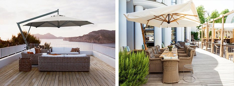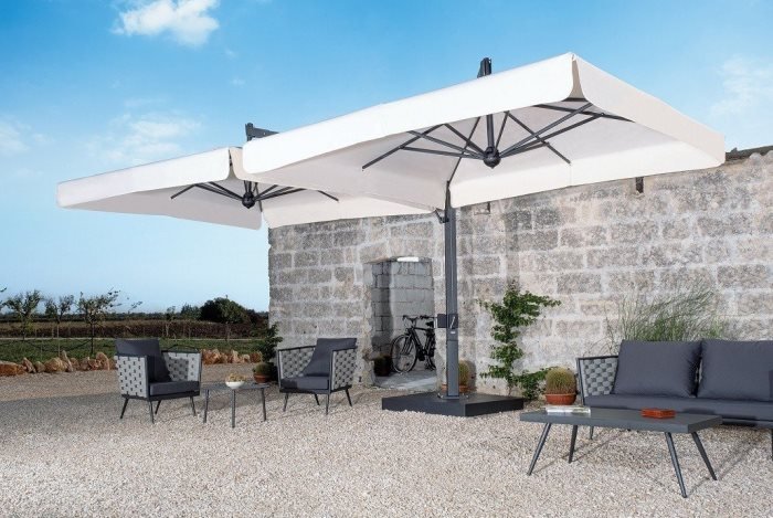 Alu Double Dark состоит из двух отдельных зонтов, закрепленных на одной центральной опоре. Модель - элегантный образец дизайна с особым вниманием к деталям и отделке. Двухкупольный зонт подходит для затенения больших пространств, при этом занимает минимум площади.