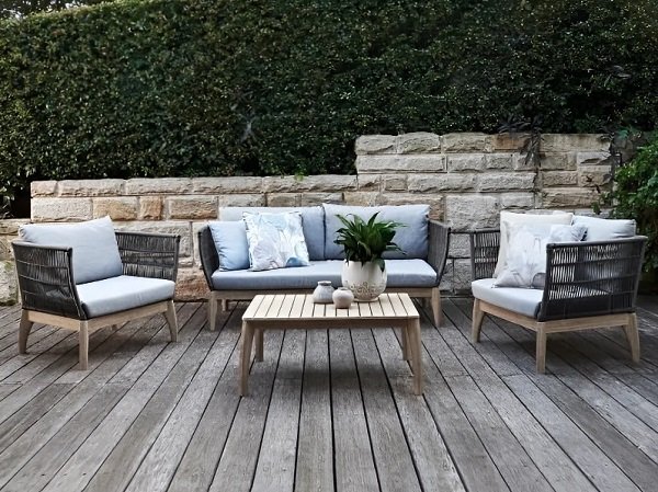 Уличный комплект для отдыха River сочетает в себе прочную выбеленную древесину акации, морской канат и водостойкие подушки. Изделия обеспечивают идеальный баланс между долговечностью и стилем.