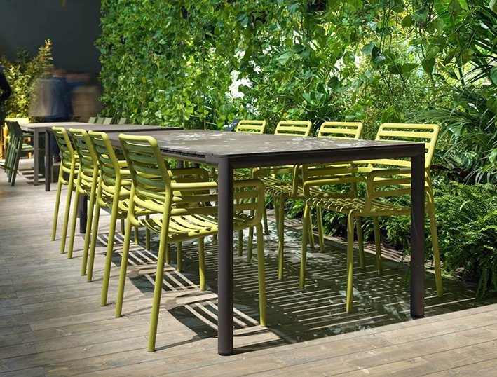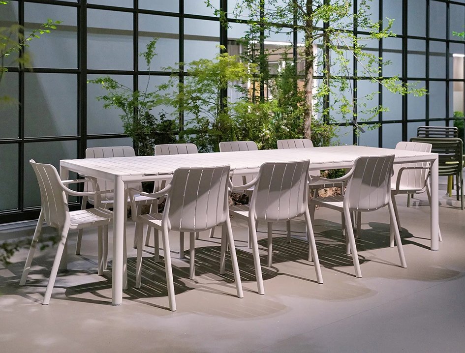 Tiberina поставляется с подлокотниками (Tiberina Armchair) или без них (Tiberina Bistrot), а стол Tevere в размерах 147/210 или 210/275.