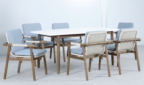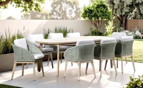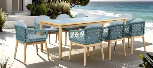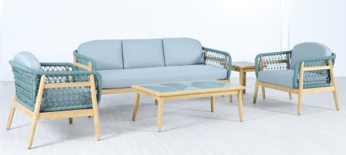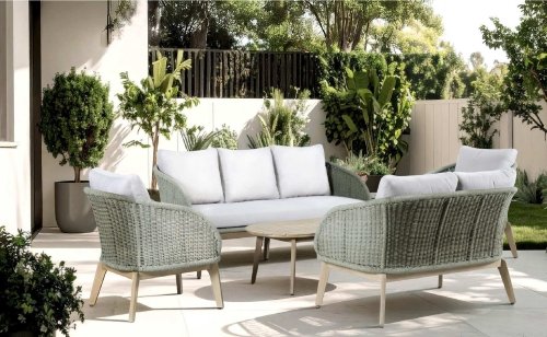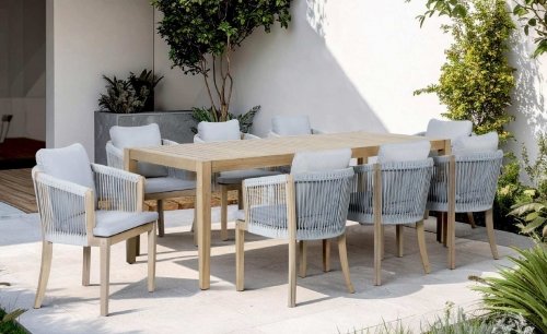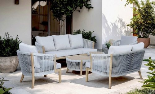 Cambria - коллекция, где встречаются тёплая текстура тика, верёвочное плетение и практичные съёмные подушки. Комплекты деревянной мебели ориентированы на тех, кто ищет премиальный внешний вид и минимальный уход.