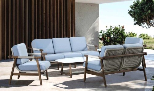 Каждая коллекция Tagliamento построена вокруг идеи сочетания натуральных материалов и практичных деталей - веревочное плетение роуп помогает смягчить визуальный образ дерева и добавить современную ритмику, а подушки и конструкции рассчитаны на уличную эксплуатацию.