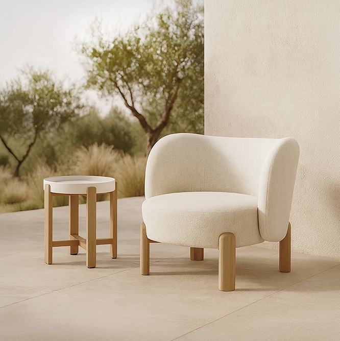 Лаунж-кресло и кофейный столик Nature - гармоничный дуэт, где функциональность встречается с природной эстетикой. Устойчивые ножки из массива тика дополнены износостойкой обивкой из олефина (у кресла) и прочной алюминиевой столешницей (у столика). Идеальный выбор для зон отдыха в отелях и лаунж-пространствах, где важны тактильный комфорт и долговечность.