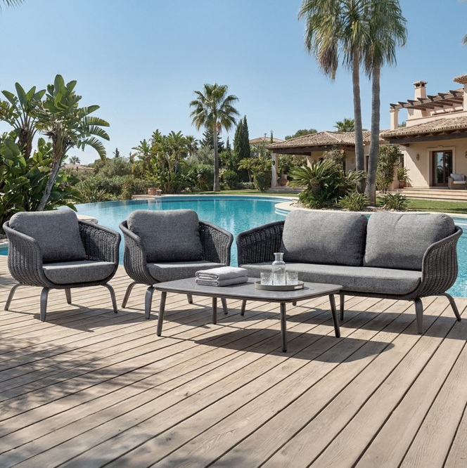 Садовые комплекты Cosy - воплощение современной элегантности и безмятежного отдыха. Просторные диваны, кресла и столик формируют гармоничный ансамбль, который одинаково роскошно смотрится в саду и в интерьере. Инновационное влагозащитное покрытие наполнителя гарантирует комфорт и долговечность в любую погоду.
