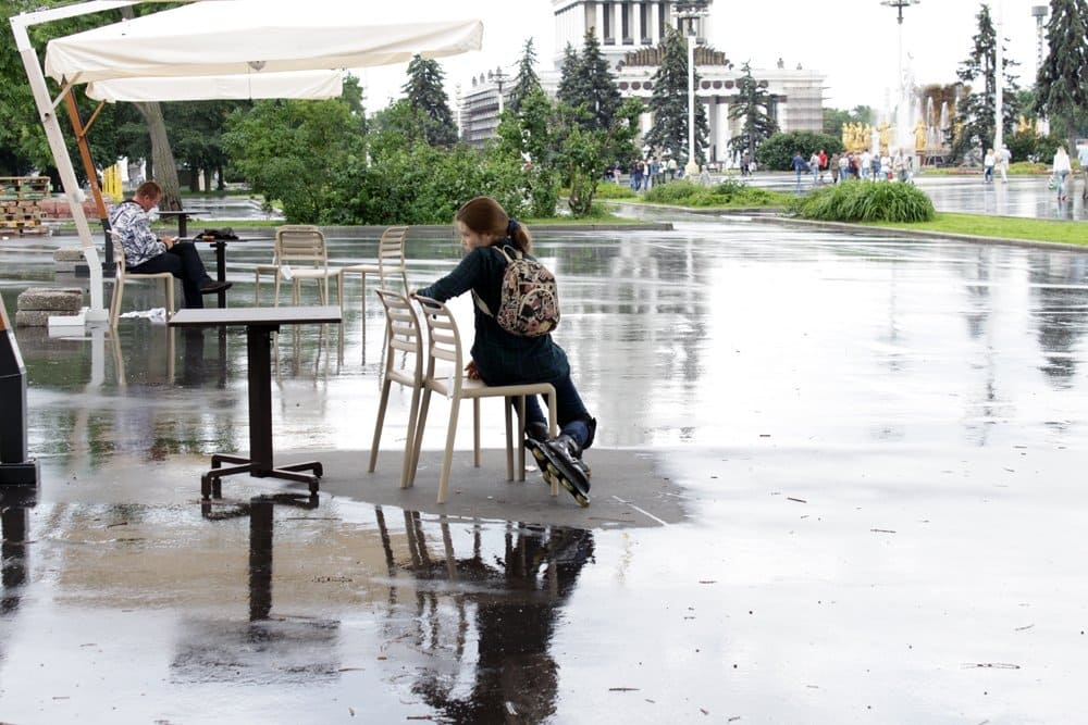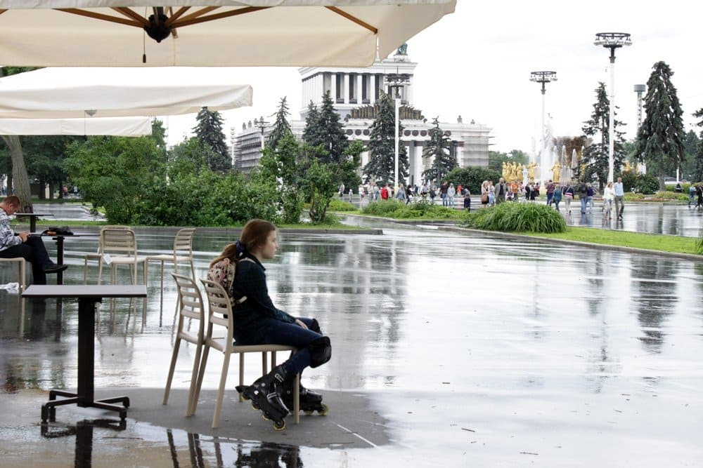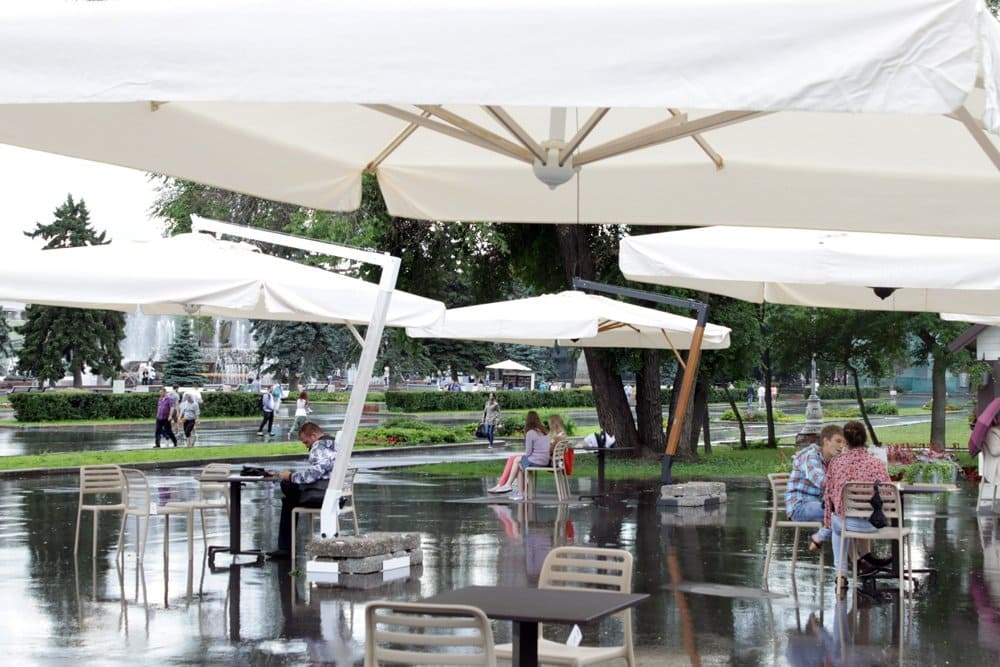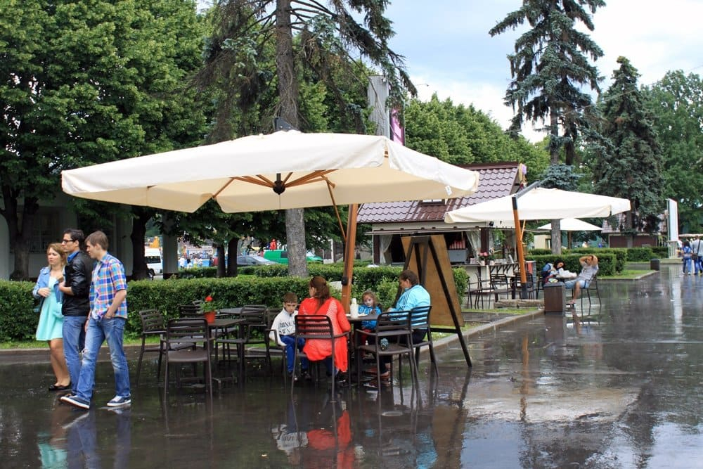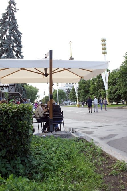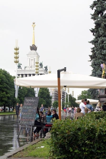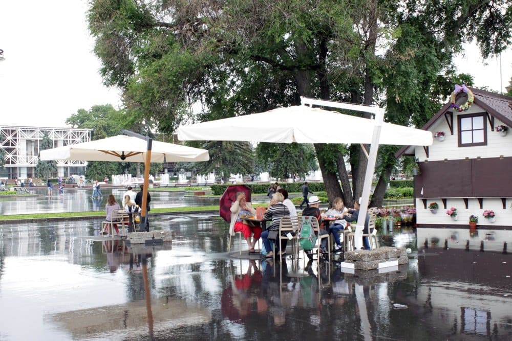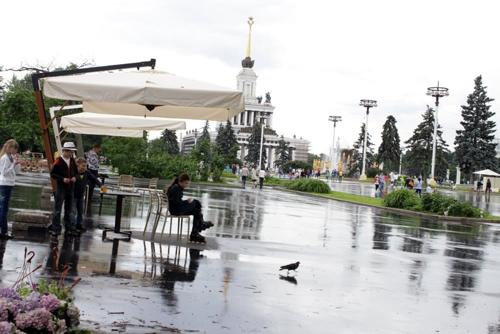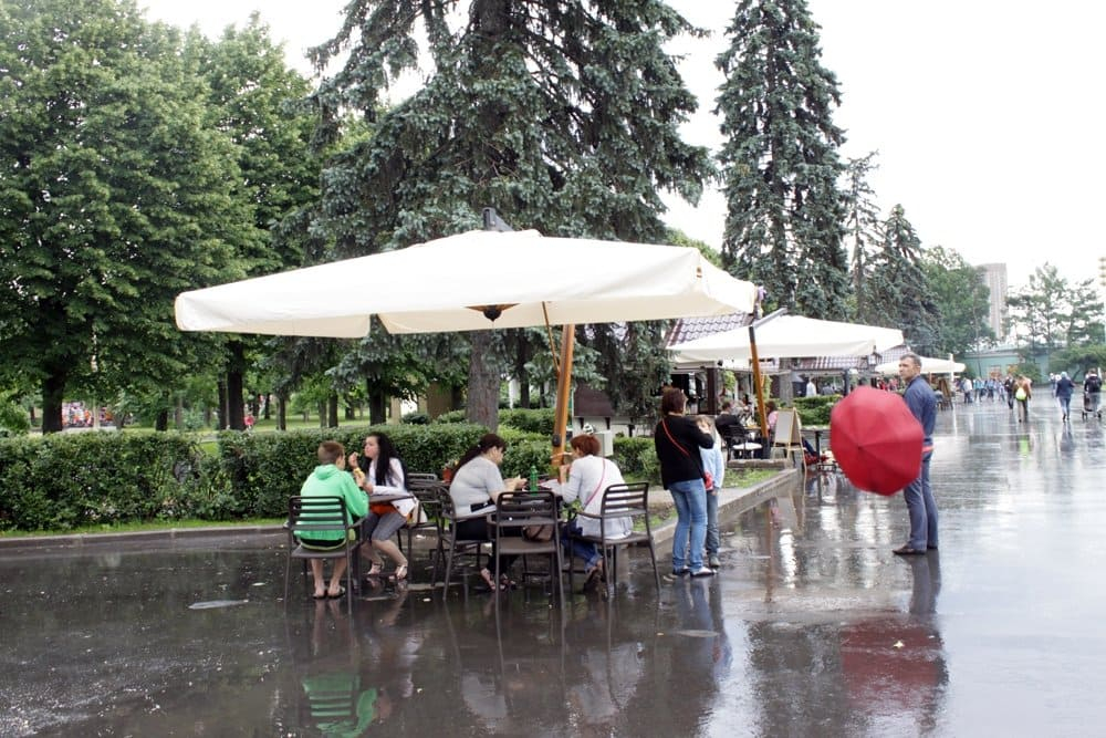В тот день была непогода, но это нисколько не омрачало настроение посетителей, т.к. частично ВВЦ приобрел образ маленькой Европы, ведь по всей территории уютно расположились летние мини-кафе в итальянском стиле.