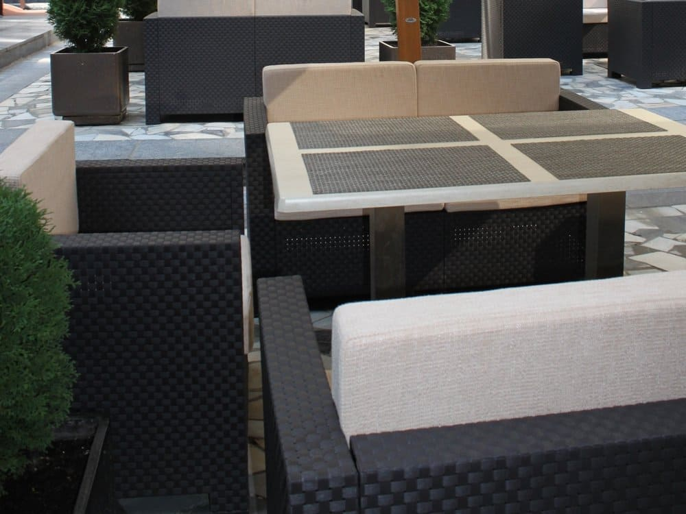 3. Кресло пластиковое плетеное POLTRONA антрацит с подушками.