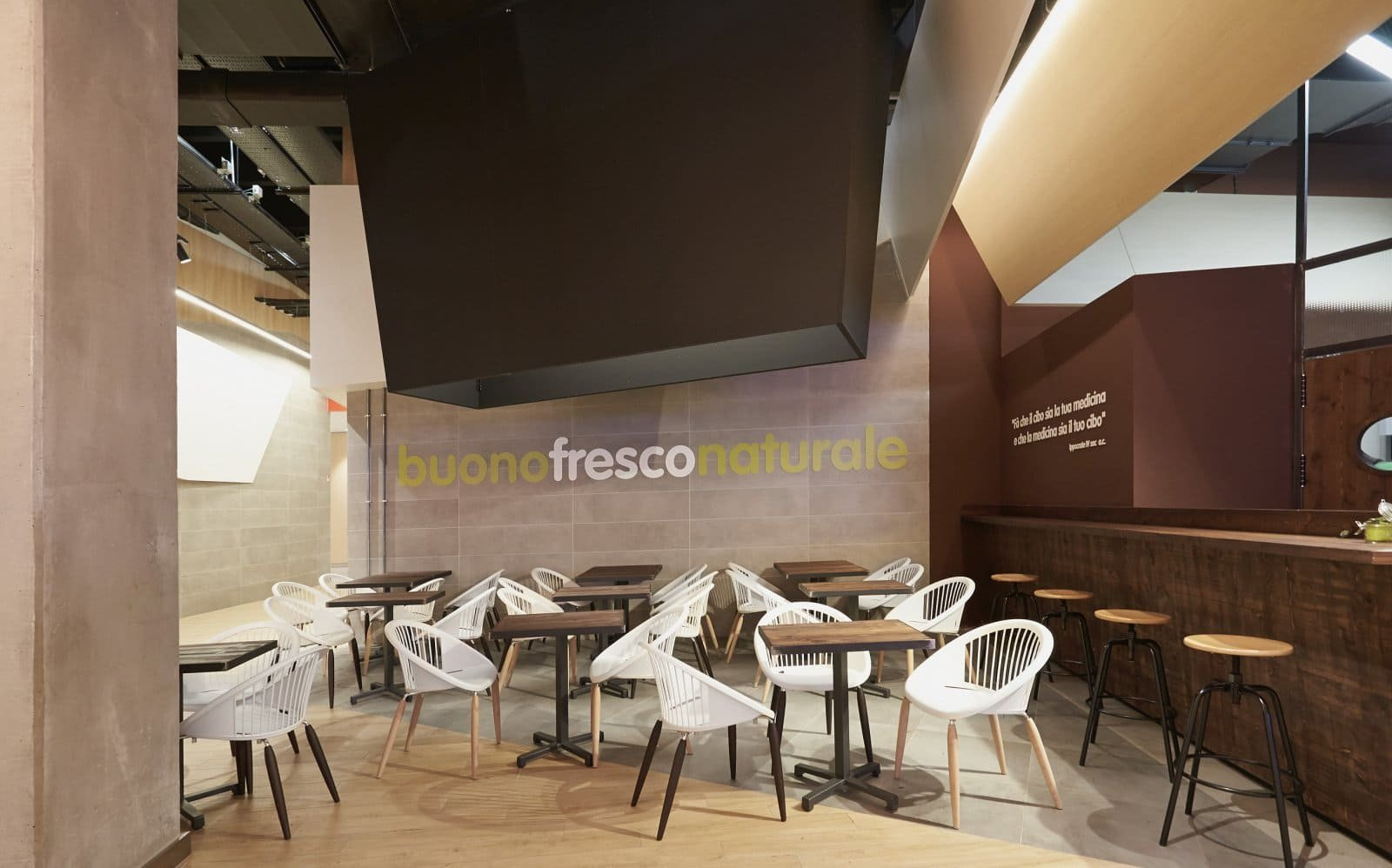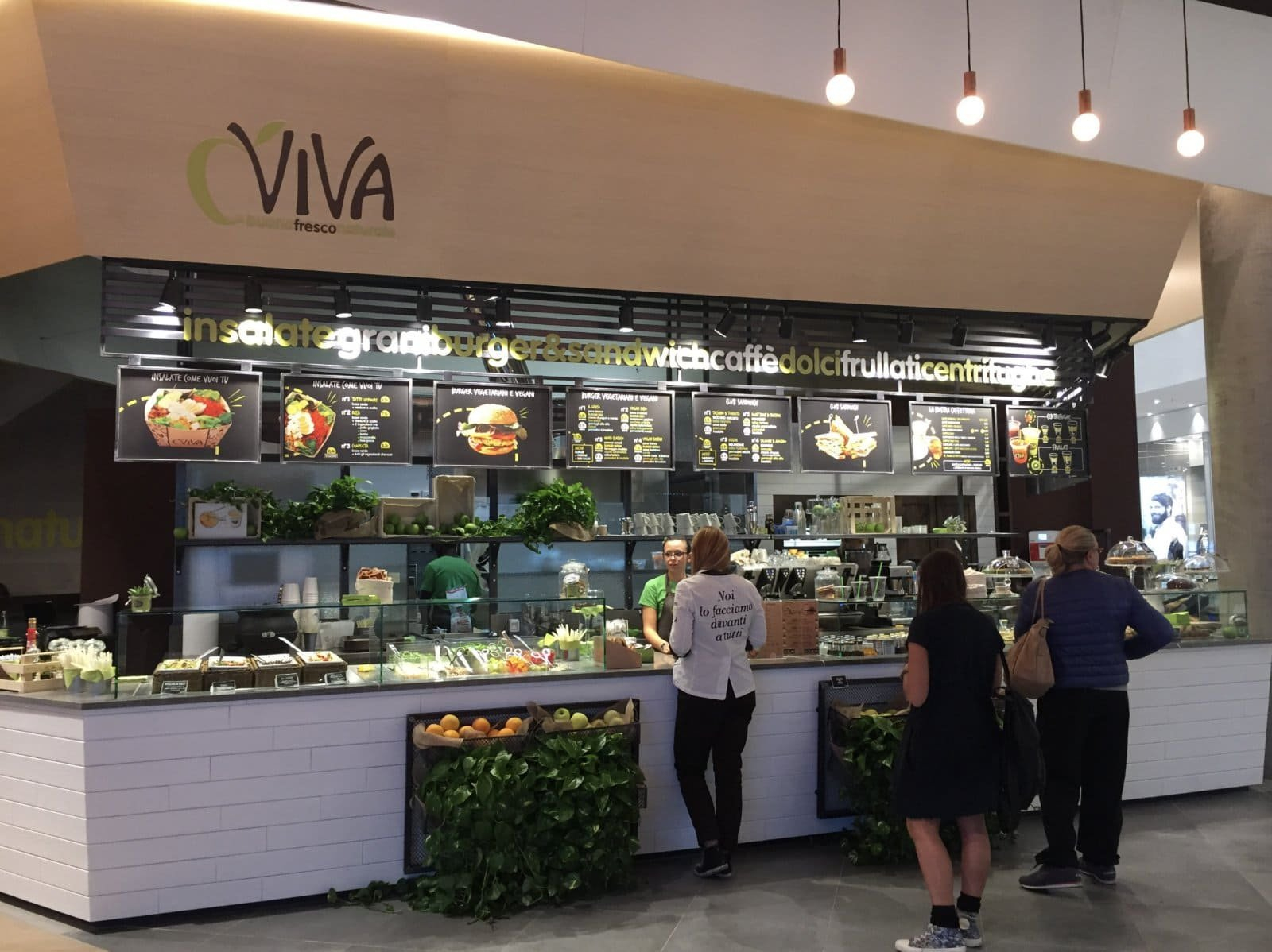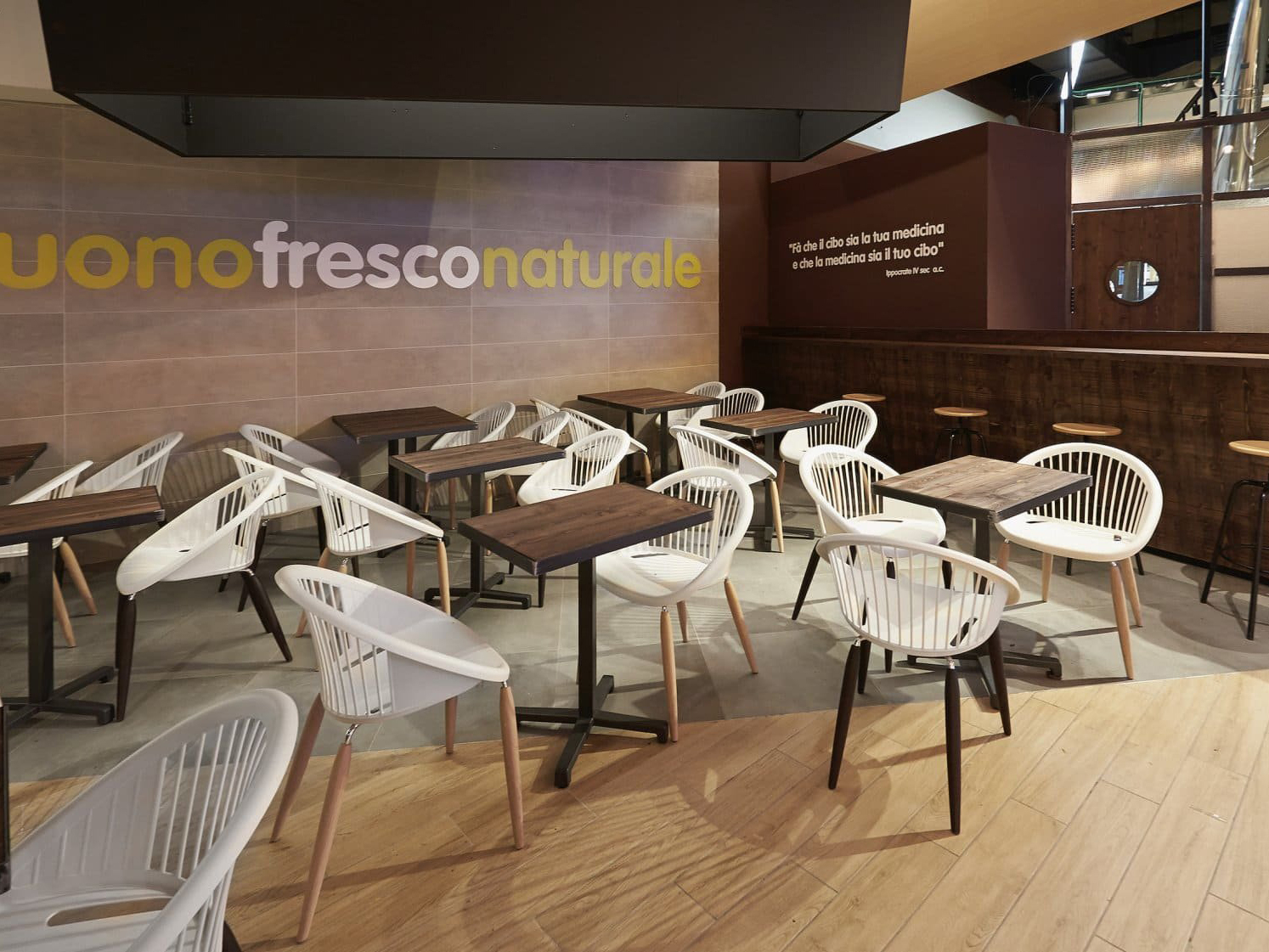 В Elnos Shopping Centre of Roncadelle теплые тона дизайнерской обстановки Viva сочетаются с яркими красками фруктов и овощей, которые клиенты могут выбрать самостоятельно для своих блюд. Во время шоппинга, посетители могут отдохнуть на удобных креслах Natural Giulia и попробовать вкусные блюда за столом с подстольем Cross, которые созданы фабрикой Scab Design.